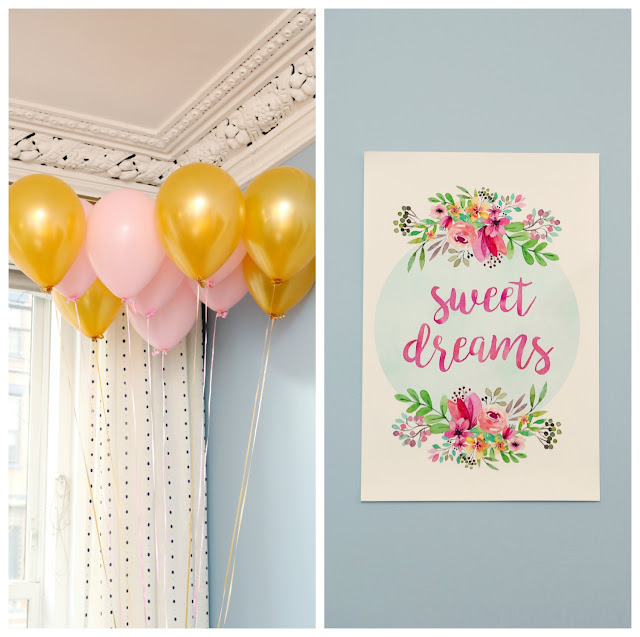 And it ended up being the easiest party I've ever thrown! Decorations were simple. I went with a pink-and-gold color scheme and just hung a few balloons and banners. I also hung up a piece of printable art from Etsy that said "Sweet Dreams." Etsy printable wall art is one of my favorite ways to decorate for a party, because 1) It's cheap. (This one cost just a few dollars.) and 2) It can be repurposed as wall art for her room after the party. As a bonus, this Etsy artist also shrunk the art down for me, so that I could also use it as favor tags!